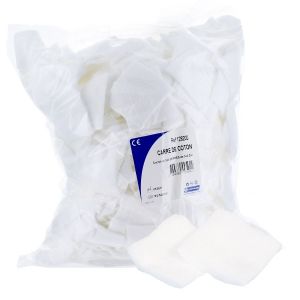 Carrés de coton Facile à prendre en main, les carrés de coton non-stériles Euromedis se séparent très facilement et ne s’effilochent pas. Très doux, absorbants et n’adhérant pas à la peau, ils sont parfaitement indiqués pour la désinfection et le soin de plaie superficielles à l’hôpital, en cabinet médical ou à domicile. Dimensions : 5 x 5 cm Conditionnement : sachet de 500 carrés de coton 5 x 5 cm.
